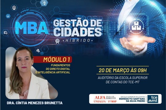 O Tribunal de Contas de Mato Grosso (TCE-MT) recebe, nesta sexta-feira (20), a juíza federal Cíntia Menezes Brunetta para ministrar a aula inaugural do MBA em Gestão de Cidades. Promovida pela Escola Superior de Contas em parceria com a Fadisp, a pós-graduação chega a sua segunda edição com o intuito de capacitar mais mil agentes públicos e servidores para os desafios da administração municipal.